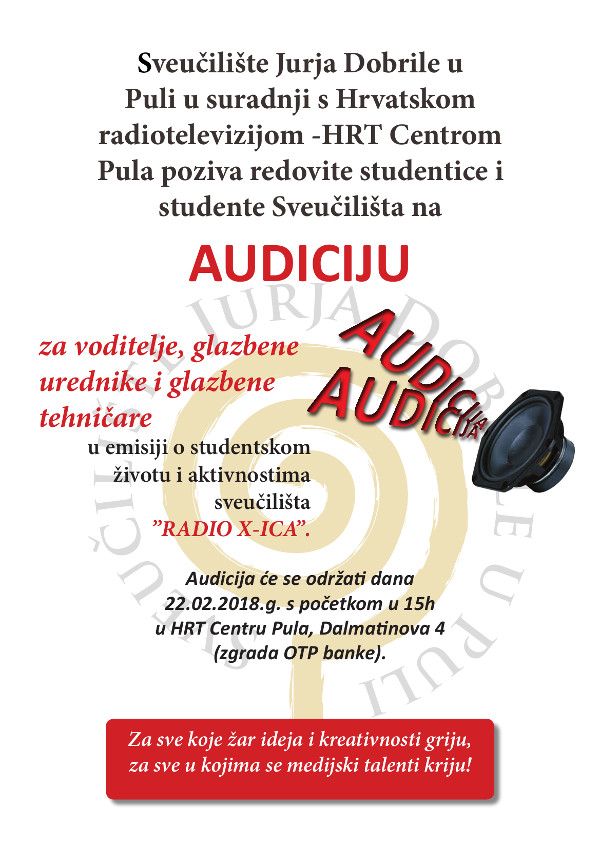 Drage studentice i studenti, svi koji bi se željeli okušati kao radijski voditelji, glazbeni urednici ili tehničari, pozivamo vas na audiciju za studentsku radio emisiju „Radio X-ica“, na HRT, Centar Pula na Radio Puli, 22. veljače u 15 sati. Očekuje vas zanimljiv i dinamičan posao na kojem ćete steći iskustvo rada u elektroničkim medijima. Popunjenu prijavnicu ponesite na audiciju.