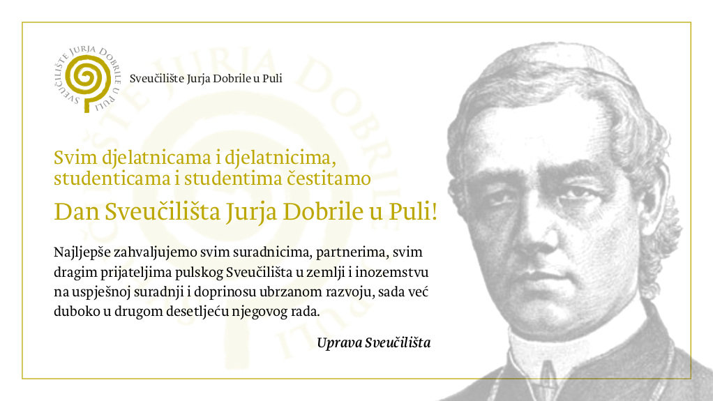 Svim djelatnicama i djelatnicima, studenticama i studentima čestitamo Dan Sveučilišta Jurja Dobrile u Puli, 16. travnja 2021. godine. Najljepše zahvaljujemo svim suradnicima, partnerima, svim dragim prijateljima pulskog Sveučilišta u zemlji i inozemstvu na uspješnoj suradnji i doprinosu ubrzanom razvoju, sada već duboko u drugom desetljeću njegovog rada. Ustrajnošću, odgovornošću i zajedništvom, stoljetnim dosezima jedinstvenog Dobrilinog nasljeđa sljubljenog s iskoracima u izazove trećeg tisućljeća, prevladat ćemo bremeniti sadašnji društveni i gospodarski trenutak, njegovati i dalje nesputanost akademskog duha i stvaralaštva te s radošću i predanošću darivati mlade generacije studenata znanjem, vještinama, kreativnošću i stručnošću graditelja budućnosti naše županije, zemlje i šire.