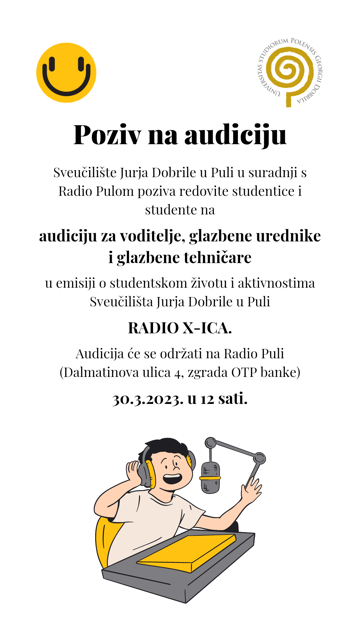 Audicija se održava za voditelje, glazbene urednike i glazbene tehničare. Više informacija možete pronaći niže. Prijavnicu je potrebno popuniti i ponijeti sa sobom na audiciju. Sretno svima!