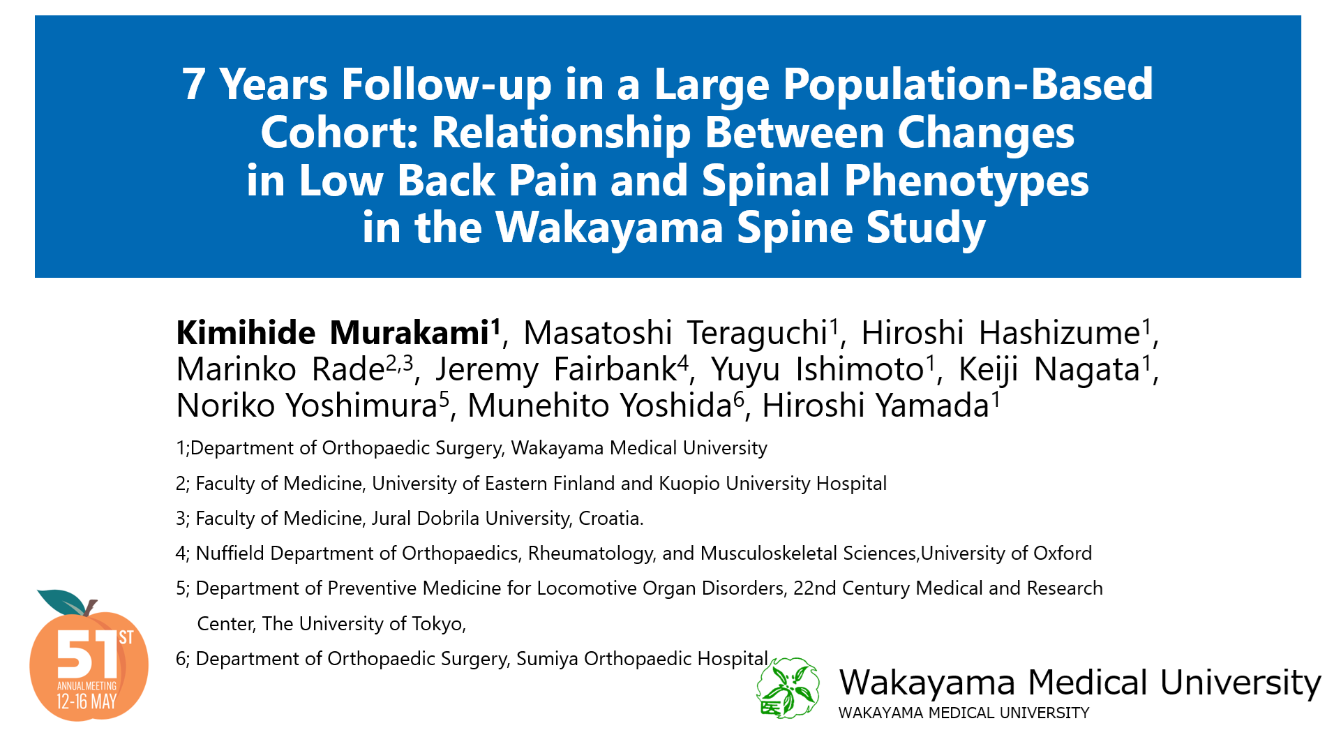 U okviru prestižnog svjetskog kongresa Međunarodnog društva za istraživanje patologije kralježnice (International Society for the Study of the Lumbar Spine – ISSLS), koji se ove godine održao u Atlanti, izv. prof. dr. sc. Marinko Rade imao je čast biti dio multinacionalnog tima koji je predstavljao rezultate međunarodne znanstvene suradnje u kojoj sudjeluju vrhunske svjetske institucije: Medicinski fakultet Sveučilišta u Oxfordu (Ujedinjeno Kraljevstvo Velike Britanije i Sjeverne Irske), Wakayama Medical University (Japan),  University of Tokyo (Japan), Sumiya Orthopaedic Hospital iz Japana, University of Eastern Finland uz Kuopio Univeristy Hospital iz Finske te Medicinski fakultet Sveučilišta Jurja Dobrile u Puli.